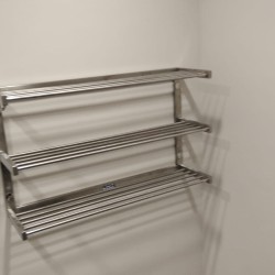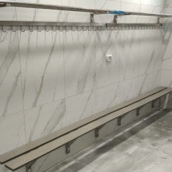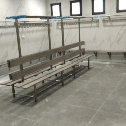 ספסלים צמודי קיר או נייחים בודד או כפול מנירוסטה בחיפוי עץ איפאה או פלדק פלסטיק דחוס דמוי עץ כולל מתלים ומדף למגבעות.